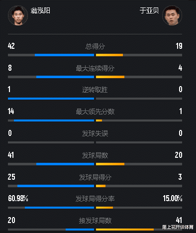 第二局比赛翁泓阳又一次在开场就掌控住了局面,通过坚决压制于亚贝的两个底角,造成对方回球失误或者不到位,把握机会能力非常强的翁泓阳,也很快建立起了8-1的领先,虽然接下来出现了一些失误,让对手连追4分,但翁泓阳及时稳住了阵脚,以11-7结束了前半局的争夺。