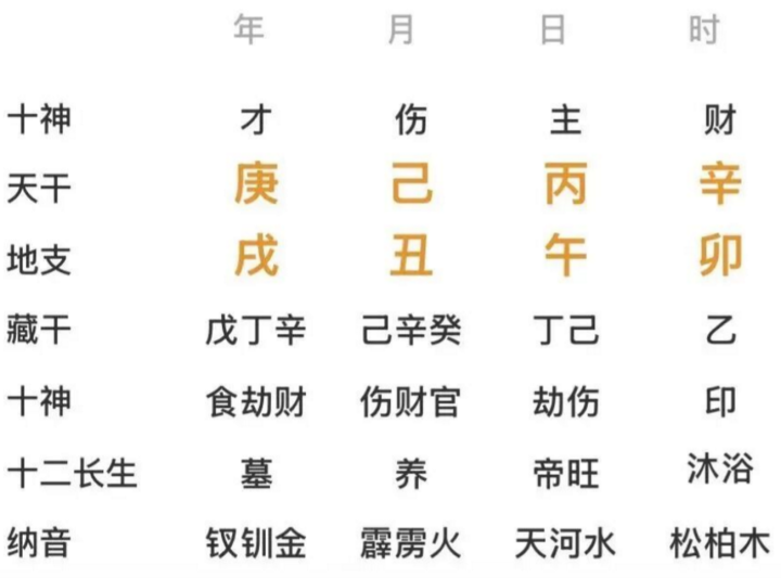 年柱为庚戌,月柱为己丑,都是属于是忌神,同时时支卯木印星空亡,这些组合一般都是代表出生都不太好,而且月柱纳音霹雳火来克年柱纳音钗钏金,在命理中有句话叫做:“提纲克年,父母不全”,所以早年有丧父的经历。
