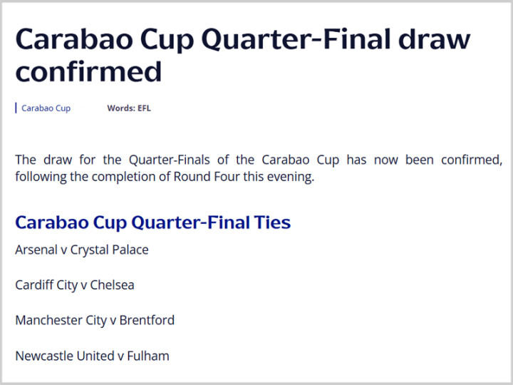 根据联赛杯官网的消息,八强对阵形势分别为,阿森纳面对水晶宫,卡迪夫城面对切尔西,曼城面对布伦特福德,卫冕冠军纽卡斯尔面对富勒姆,前者为主场,安排在12月17日的那个周中,具体的比赛时间待定。