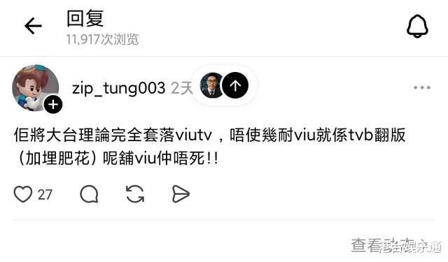 粉丝“zip-tung003”称:“他(金广诚)将大台(TVB)理论完全套到ViuTV上,不用等多久,ViuTV就会变成TVB翻版!这次ViuTV还不死?”
