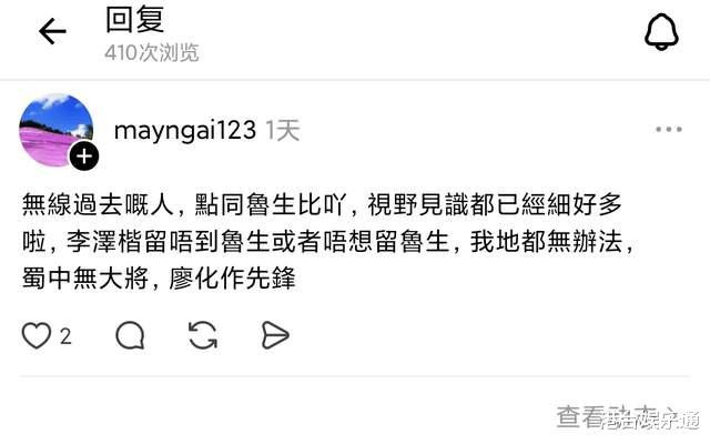 粉丝“mayngai123”则称:“无线(TVB)过来的人,怎么和鲁先生比啊?视野和见识都小很多啦!老板留不住鲁先生,或者不想留陆先生,我们也没办法,蜀中无大将,廖化作先锋。”