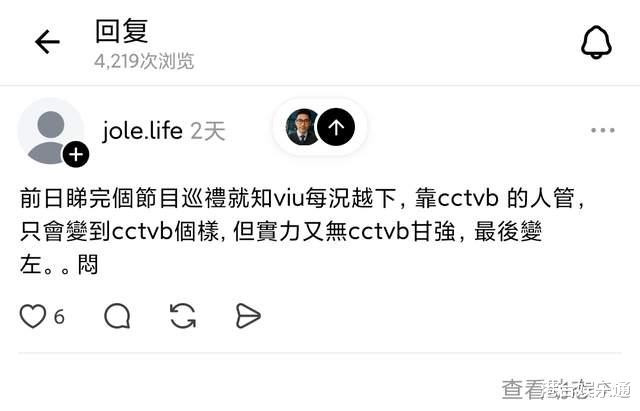 粉丝“Jole·life”也表示:“前天看完节目巡礼,就知道ViuTV已经每况愈下了,靠TVB来的人管理,只会让ViuTV变成TVB的样子。但实力又没有TVB强,最后变成……闷。”